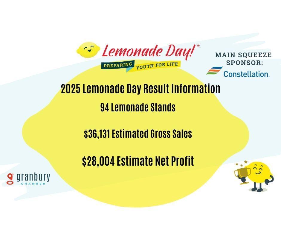 The next Lemonade Day is Saturday, May 16, 2026, from 10 a.m. to 2 p.m., at stands to be located throughout the community. Check out the Granbury Chamber of Commerce website for more info.
